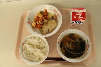 今日の給食は、ご飯、牛乳、宮崎産カンパチの西京焼き、豚肉と厚揚げの炒め煮、千切り野菜のすまし汁でした。カンパチは40~100センチになる大型の魚です。今日のカンパチは宮崎県産のカンパチを味噌に漬け込んで西京焼きにしたものだそうです。Sさんは、「宮崎産カンパチのがとてもおいしかったです。」と言っていました。