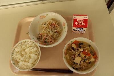 今日の給食は、ご飯、ひじきのり、牛乳、春雨の中華和え、豆腐の中華煮でした。K君は「春雨の中華和えの春雨がちょうど良い味でおいしかったです。」と言っていました。