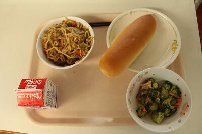 今日の給食は、ミルクパン、焼きそば、牛乳、チキンとブロッコリーのサラダでした。今日はベジ活の日で、小学校約140g、中学校約170gの野菜が使われているそうです。
