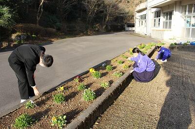 今日は朝のボランティアの日でした。花壇の草抜きと寄せ植えの枯れている葉っぱをとってくれていました。朝からお疲れさまでした。