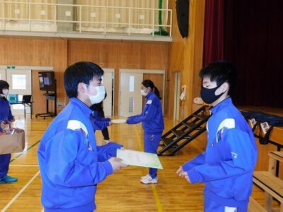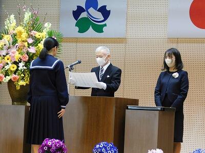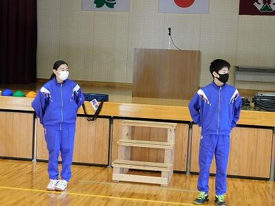 今日は令和3年度の修了式が行われました。令和3年度の反省を1年生のUさんと、2年生のS君が原稿を見ずに堂々と述べてくれました。その後、校長先生より1年生のNさんと2年生のHさんに修了証が授与されました。