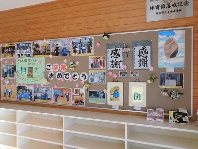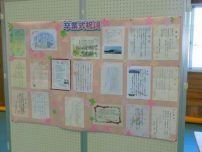 今日のは卒業式準備後半戦で主に掲示関係の準備をしました。明日卒業生が、気持ちよく卒業できるように全員で心を込めて卒業式の準備を頑張りました。体育館に入ると正面に卒業生の思い出が掲示してあります。明日のホームページで紹介する予定です。