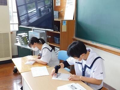 昨日の5,6校時の総合的な学習の時間は、1年生はノートPCを使って7月に行われるふるさと探訪の調べ学習、2、3年生はノートPCを使って、7月に行われる3校合同修学旅行の『修学旅行のしおり』作りと千羽鶴作りをしました。