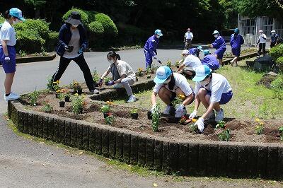 昨日の4校時は雨のため延期していた花壇の植栽を行いました。マリーゴールド、サルビア、ブルーサルビア、ベゴニアを植えました。暑い中の植栽でしたが、みんな一生懸命取り組んでくれました。花壇の花を植え替えしたことで、生命を大切にする心が育ってくれることと思います。