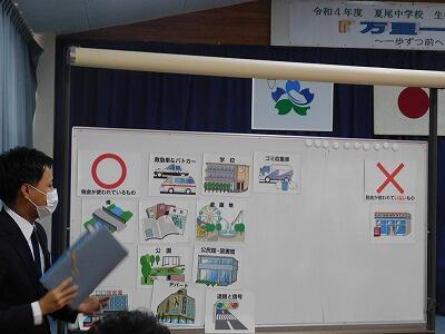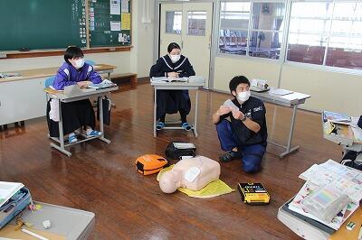今日は、2年生保健体育の保健の授業で心肺蘇生法を学習しました。合わせてAEDの使い方についても学習しました。夏尾中ではAEDは体育館の玄関前に設置しています。