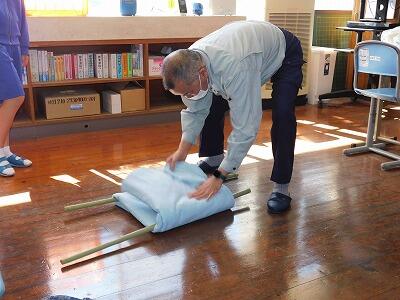 昨日は、都城市危機管理課のSさんに来ていただいて1、2年生対象の防災教育の授業を実施しました。まず、ダンボールとナイロン袋を使ってのトイレ作り、ペットボトルを使った簡易シャワー作り、お風呂用の水のため方を学習しました。その後、災害時にケがをした場合の応急処置方法、竿とタオルケット使っての担架づくり、非常持ち出し袋に入れる最小限の品物を確認しました。