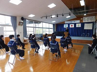 始業式では、2名の生徒が新学年の抱負を述べました。新2年生のSさんは、復習をしっかりすること、後輩の手本となること、部活の公式戦で1勝すること、また、新3年生のUさんは、志望校に合格できるように学習面をがんばること、夏の中体連で県大会に出場できるようにがんばること、夏尾中をリードして笑顔で過ごせる学校生活を送ることなどを述べてくれました。新学年での熱い思いが伝わってきました。