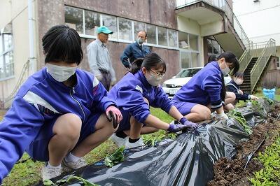 4月25日(水)今日は朝から冷たい雨。加えて肌寒い。H先生が出勤早々「雨ですね~今日は芋の苗植えはできませんね~」と残念そうにつぶやかれました。どうやら3年生の技術の授業「生物の育成の技術と原理・法則と仕組み」の単元でサツマイモの苗植えを計画されていた様子。雨がやむといいなあ~と願っていると、なんと3時間目には雨がやみました。早速、元気100倍のH先生の指導のもと、雨にも寒さにも負けない3年生は芋の苗植え作業にがんばりました。たくましい3年生です!収穫の時期が楽しみですね。