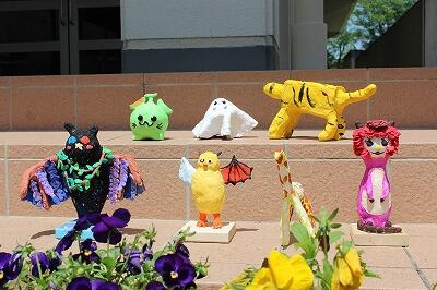 昨日ホームページ上にアップした5体の謎の生物の正体は、美術の単元の「身近な動物から発想する」で3年生が昨年の後半から製作していた動物たちでした。2つの物を組み合わせたり言葉からイメージを膨らませたりして新しい想像の動物をつくったようです。完成した作品を校庭の自然の中に置いて、M先生の指導のもと撮影会でした。