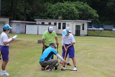 5月12日(金)「ふれあいグラウンドゴルフ大会」を開催しました。本大会は福祉教育の一環として、地域の高齢者の方々と共にグラウンドゴルフを楽しむというものです。これまでコロナ禍で実施できず、実に4年ぶりの開催。当日は天気にも恵まれ、夏尾・御池地区の高齢者の方々が20名参加してくださいました。グラウンドは前日に市の環境整備員のSさんとTさんがきれいに草を刈り整備してくださっており、絶好のコンディション。久しぶりにグラウンドに生徒と高齢者の方々の歓声が響きました。