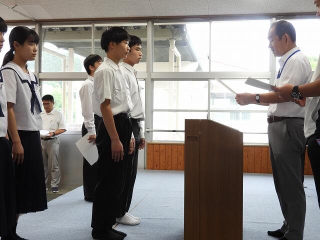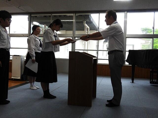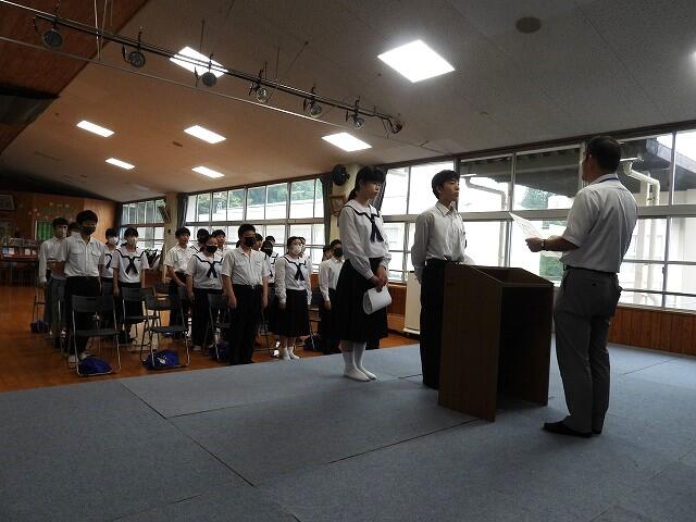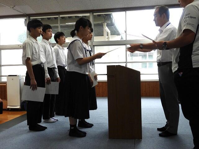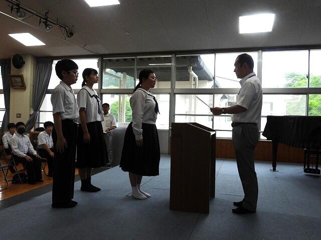 6月10日(火)都城地区中学校総合体育大会とQubena月間賞の表彰を行いました。バドミントン男女団体戦準優勝の賞状を校納。バドミントン個人戦、Qubena月間賞の順に表彰を行いました。県大会での活躍を楽しみにしています。