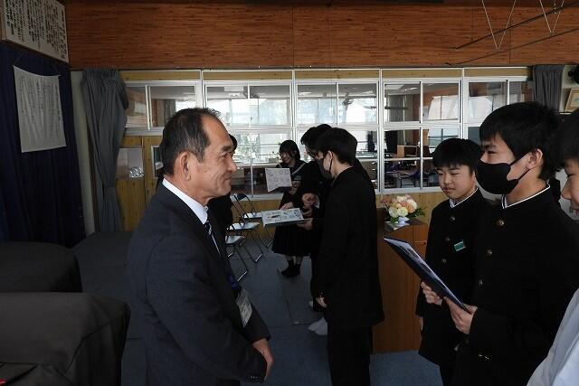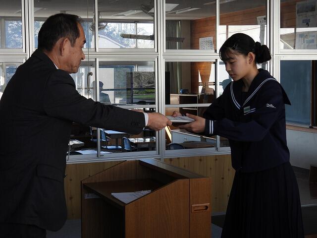 1月16日(金):『都城市教育委員会精励賞』の表彰式がウエルネス交流プラザで開催されました。この賞は、他の生徒の模範となる行為や技術・芸術文化の分野において顕著な業績のあった生徒を称えるために制定されています。夏尾中からは、3年生2名が受賞し、賞状が授与されました。