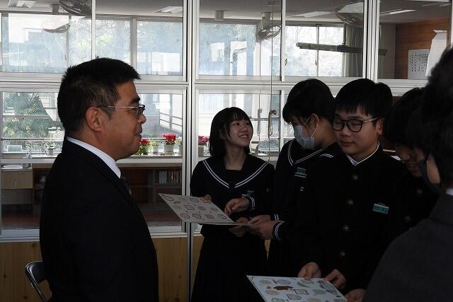 12月23日(火):みやこんじょPR課と都城メンチ協議会が取り組んでいる受験生応援企画『都城メンチ』が、給食の時間に実施されました。福ちゃんポークの福留さんと市の担当者の方々が来校され、3年生8名にメンチカツが手渡されました。この企画は、市内19中学校の3年生約1600人を対象に、夏尾中を含む4校には現物を、残り15校には引き換え券を配布する取組です。「運気を”揚げて”、受験に”カツ”」頑張れ3年生!!