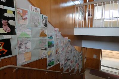 中校舎1階から美術室へ続く階段、そして北校舎2階の廊下が、色鮮やかな「小さな美術館」になっています。