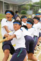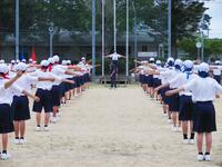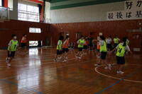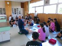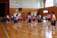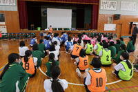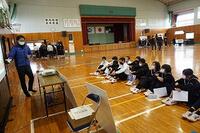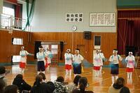 総合的な学習の時間に、1年生が保存会の方々から民俗芸能を学んでいます。1組が木剣踊り、2組が手拍子踊りです。