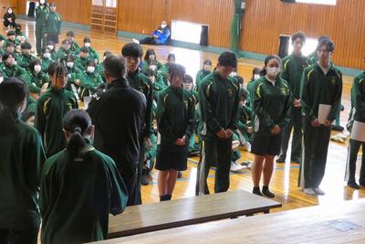 コロナ禍や昨年の地震など、私たちを苦しめた出来事から学んだこと、そして、新しい年に向けての決意が話されました。また、それぞれの学年で目標を立て、積極的に取り組んでいくという力強い声が聞かれました。教職員からは、健康に気をつけながら学校生活を送ること、挨拶を心掛け明るく元気な学校にしていこうということ、そして、3年生は進路に向けての準備を始めることなどの話がありました。