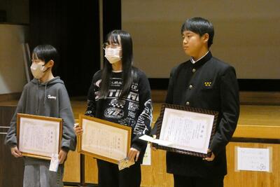 各学校の代表生徒による意見発表が行われました。児童生徒の皆さんの将来の夢や思いについて発表が行われました。それぞれにいろいろなことに挑戦し、経験をもとに感じたことを将来の目標に掲げていました。明るい未来に向けて大いに羽ばたいて欲しいと思います。