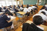 1年生は課題学習で英語のワークに真剣に取り組んでいました。小学校の復習で、単語のスペルの確認をしていました。