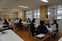 放課後は職員研修で、この研究授業の参考になるよかった点と課題について協議します。教育実習生も入って学年ごとに、活発に意見を交換しました。