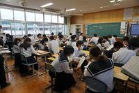 研究授業の1回目は、3年2組の英語です。「基礎学力の定着」をめざして取り組んでいるため、前時に学習した「現在完了形」の小テストから始まりました。