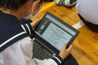 理科では、先生の質問にチャットでどんどん答えていました。国語では、自作のプレゼンシートを使って授業を進めるため、パソコンを2台つなげていました。