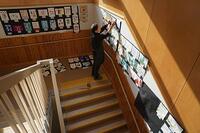 中校舎の階段では、美術の先生が新しい作品を掲示していました。1年生の風景画です。来校の際にご覧ください。