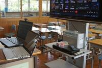 理科では、先生の質問にチャットでどんどん答えていました。国語では、自作のプレゼンシートを使って授業を進めるため、パソコンを2台つなげていました。