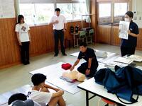 胸骨圧迫やAEDの使い方を中心に実技演習を行いました。生徒は積極的に取り組んでいました。