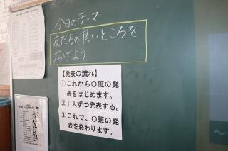 本日、12/19(金)の⑥校時、1の3にて特別活動の研究授業が行われました。題材は、「ともだちの良いところを広げよう」です。各班ごとに、他の班のメンバー一人一人の良いところを発表し合いました。自分の良いところを発表してもらっている間は、照れくさそうにしながらも、うれしそうな表情を浮かべている姿が印象的でした。人のいいところに目を向けていこうというマインドがクラス全体に広がっていきました。