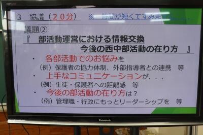 本日のさくら咲くタイムの時間において、校長先生を中心に、部活動顧問の先生方を対象に、部活動の研修が実施されました。自主的・主体的な部活動を目指して、本校の部活動の方向性について理解を深め、今後の運営における共通理解・情報交換を行いました。働き方改革を進める一方で、スマートで効率の良い充実した活動となるよう学びを深めました。