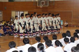 本日、県秋季大会の推戴式が行われました。地区の代表にふさわしく、各部ともに力強いあいさつ・メッセージが述べられました。校長先生、3年生の生徒会長からも激励の言葉をいただきました。目を輝かせて話しを聞く様子にりりしさがあり、今後の活躍が大いに期待されます。選手宣誓も立派に行われました。以下、その様子の写真です。