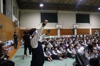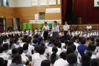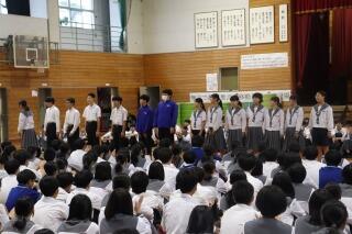 11.19(火)の⑤⑥校時を活用して、鑑賞教室が実施されました。五十市中のサポートをいただき、日本の伝統芸能「能」を鑑賞させていただきました。梅若研能会の皆様、ボランティアスタッフの方々のおかげで、充実した体験活動、能の鑑賞をさせていただきました。新生徒会文化委員会の進行、お礼の言葉、放送委員会の細やかなサポートに助けられました。また、代表で体験してくれた生徒もしっかり活動し、終わりに質問がないか?を問われたときも、3人の生徒が堂々と質問してくれました。梅若研能会も方々からも、お褒めの言葉をいただきました。