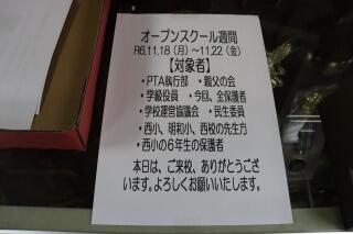 ②オープンスクール週間は、毎年、11月下旬に1週間、フリー参観を実施しています。対象者は、上記のメンバーはもちろん、全保護者、広く地域の方にご案内しています。なお、今年度は、西小の6年生の保護者にもお声かけさせていただいています。西中の改善につなげてまいります。都合のつく時間のみで結構です。どうぞ、ご来校ください!