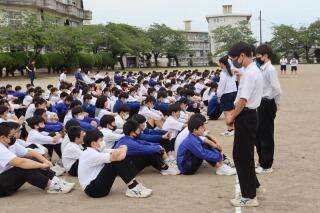 いよいよ勝負の夏!3年生にとって、最後の地区総合大会が近づいています。本日は、その選手推戴式でした。各部の気持ちのあふれた決意表明、生徒代表の激励の言葉、校長先生の「よい気」をチームとして出していこう!という心強いお話をいただき、最後はみんなで心を一つに柏手を打ちました!以下、推戴式の一場面です。
