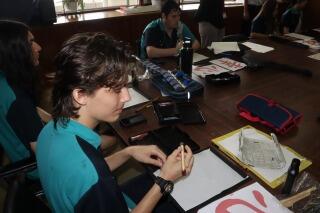 本日9/26(木)、5校時には、1年1組といっしょに都城市役所のサポートを受けて、ハロー元気講座で都城の歴史についての講座でした。土器の見学や、鎧、日本刀、雪舟の掛け軸などの説明、見学をしました。日本独特の文化に触れて、1の1の皆さんも、オーストラリア中等学校生の皆さんも、深い学びができました。以下は、その様子の写真です。