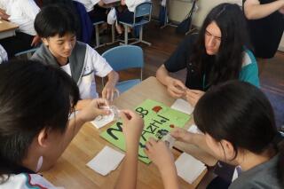 9/25(水)2校時、本校に来られている新盛支援員のご指導で、書道体験をしてもらいました。はじめて筆を持ったとは思えない実力にびっくりしました。ご指導いただいた新盛支援員、案内、書道道具を提供してくれたホストファミリーの生徒の皆さん、通訳等でお世話になった英語科の先生方、本当にご協力ありがとうございました。