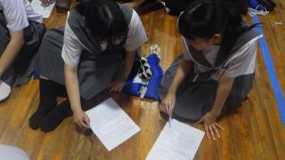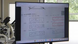 本日の音楽の授業は、1年生を対象に、ボディーパーカッションを取り入れ、生徒が主体的に表現活動をし、発表する内容でした。笑顔いっぱいにいろいろなアイデアを出す姿が印象的でした。演奏は録画し、動画として提出しており、1年生もかなりタブレット端末の活用スキルが上がっています。