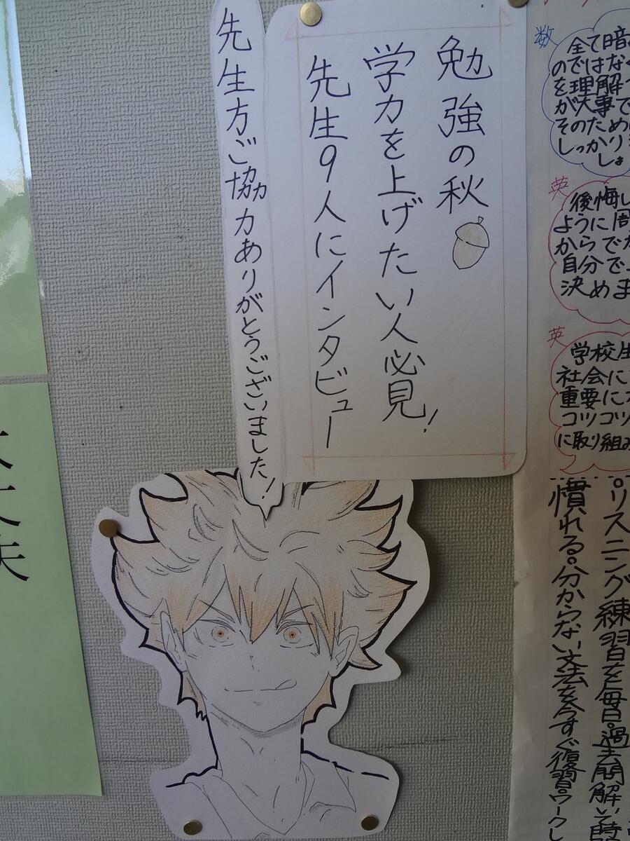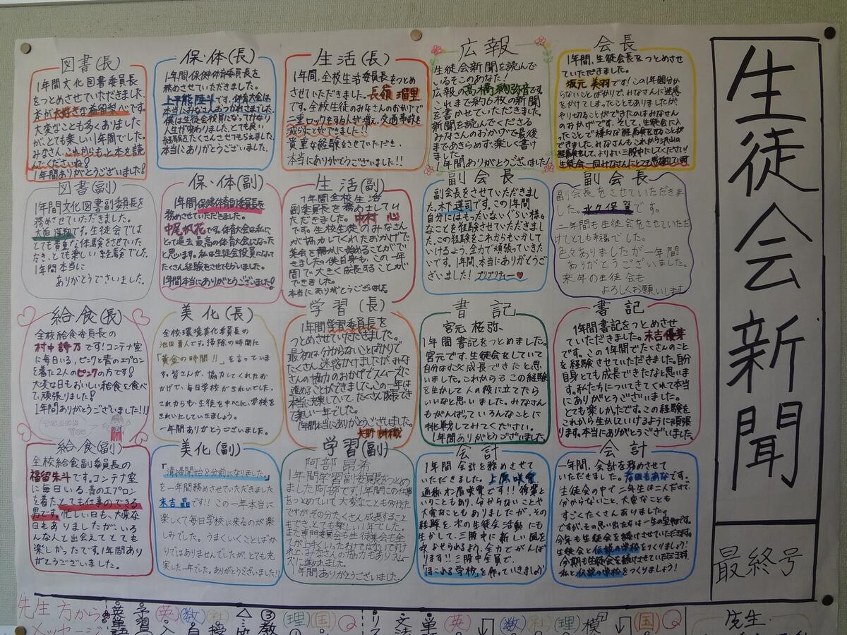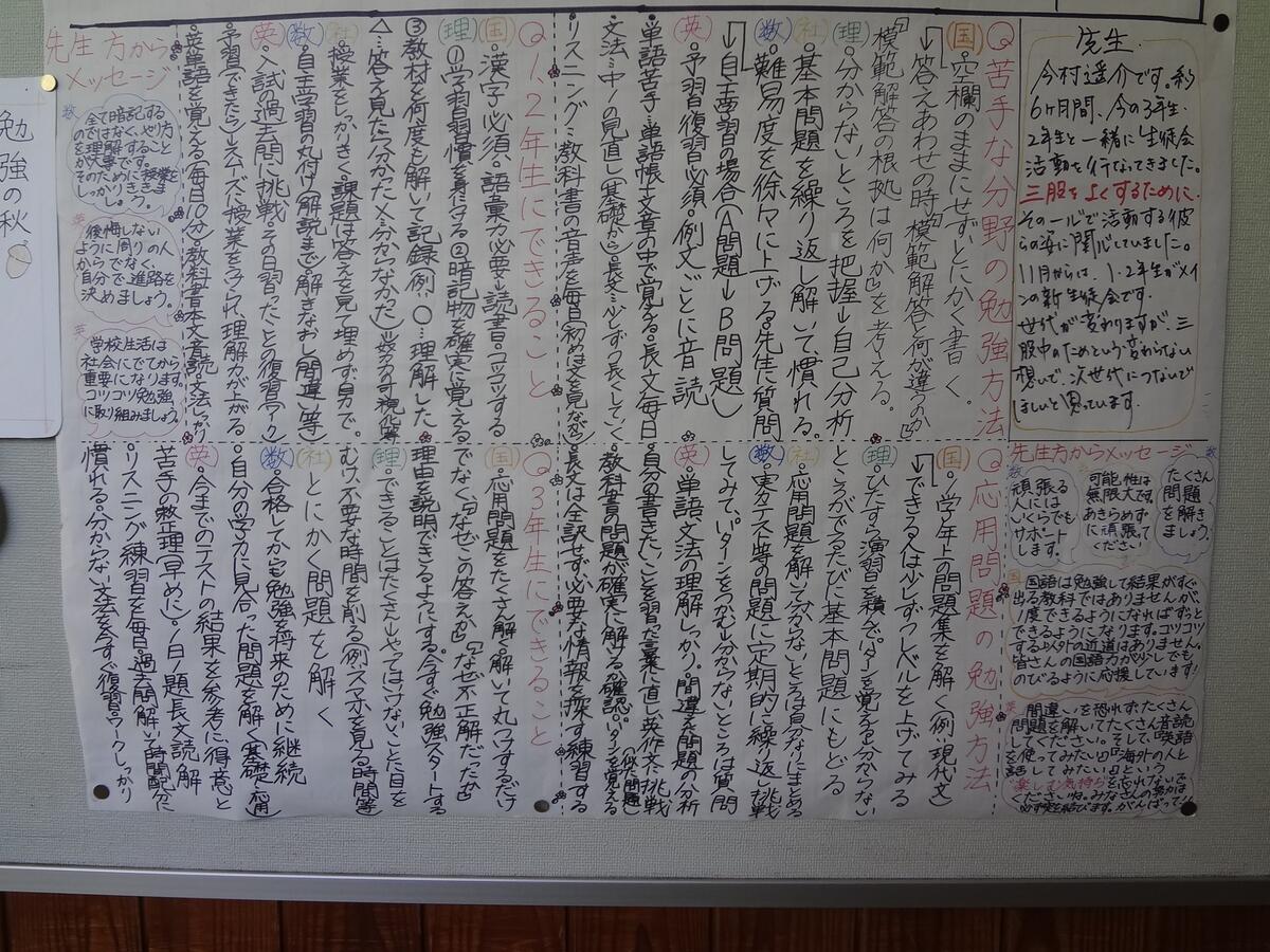 生徒会新聞を掲示しましたと放送があり、見てみると、生徒会執行部のお礼の言葉がびっしりと記されていました。学校では、中心となる生徒会執行部や専門委員長・副委員長の活躍に視線が集まりがちですが、その生徒が、『全校生徒の協力に感謝を忘れていない。』ことが、とてもうれしく感じる新聞です。さらに、期末テスト前を意識してなのか?9名の先生方からの、『苦手な教科の勉強方法』や、『学力を上げるコツ』について記されていました。
