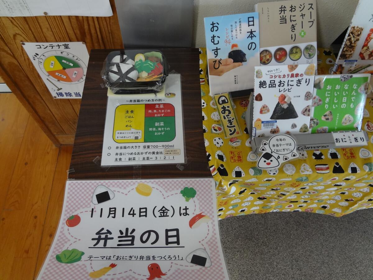 給食コンテナ室前には、11月14日(金)の『お弁当の日』に向けての特設コーナーができています。食べることも大切ですが、買えば何でもそろう時代ですが、『自分で料理をする』こともとても大切です。この機会に料理に目覚めてみてはいかがですか!