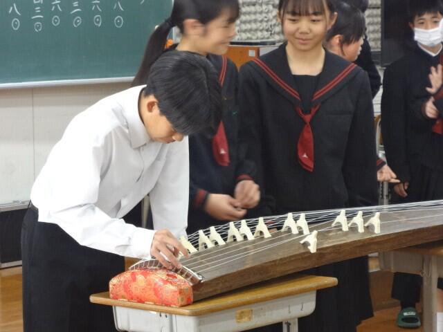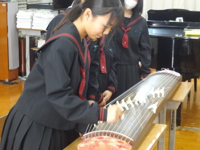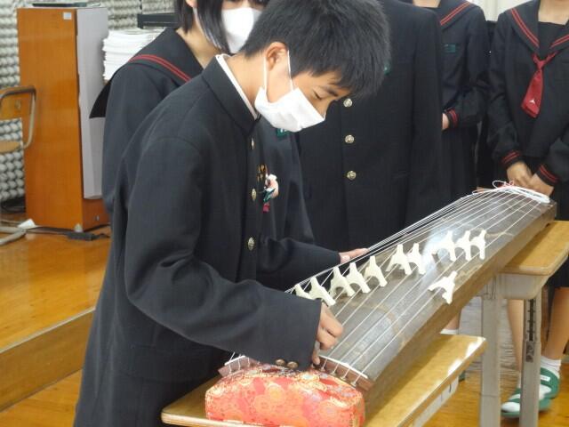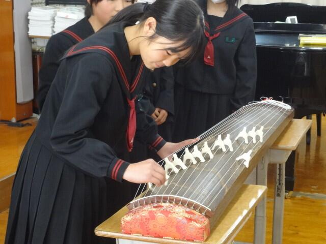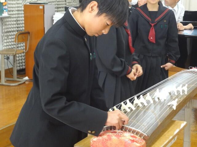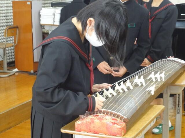 音楽室から、拍手が聞こえてきたので覗いてみると、「お琴」の演奏テスト?中でした。神秘的な音色に聞き入ってしまいます。学年室では、先生方が、少ない空き時間を利用して、「生活の記録」に目を通し、コメントを一生懸命に記入されてました。