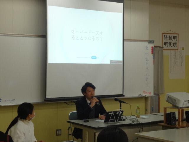 今日の5時間目に1・2年生は、薬物乱用防止教室が実施されました。学校薬剤師の坂元美王 様に「オーバードーズ」について講義をいただきました。「学級や家庭などのコミュニティーで仲間を一人ぼっちにしないことが大切」→「様子の変化に気づく」→「悩みがあるのかな・・・?」「不安なことがあるのかな・・・?」「寂しくないかな・・・?」みんなが笑顔であることが大切であることを学びました。