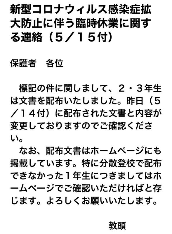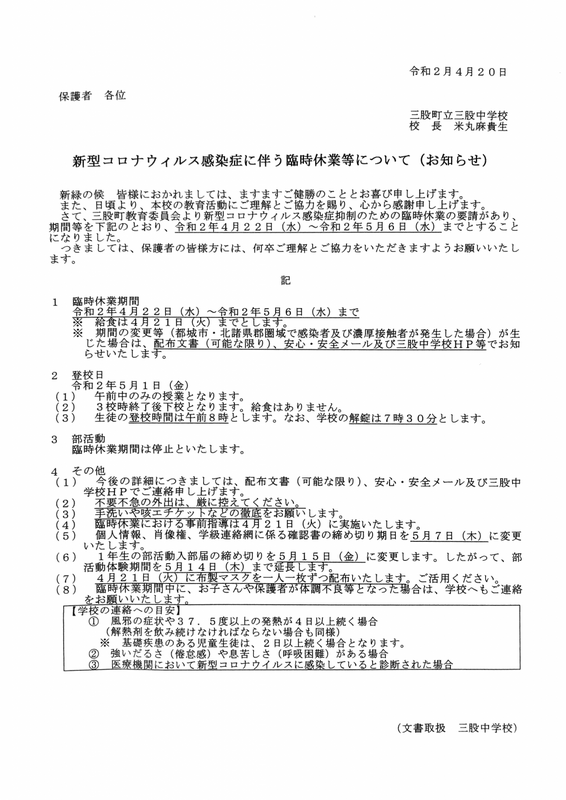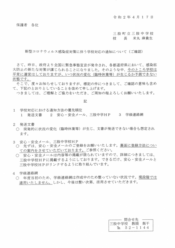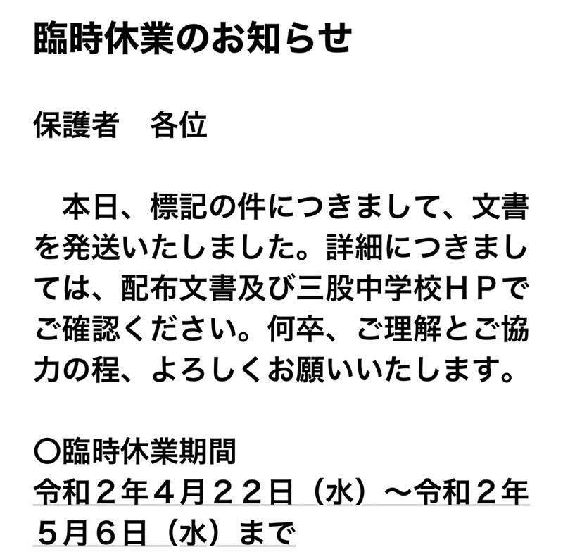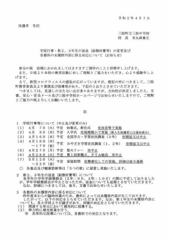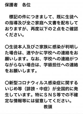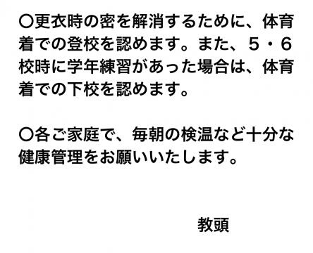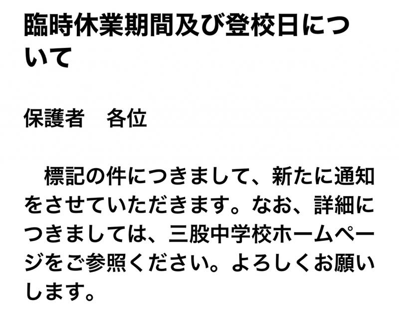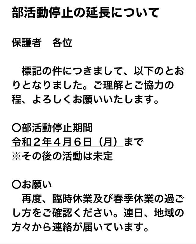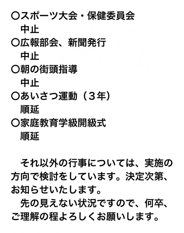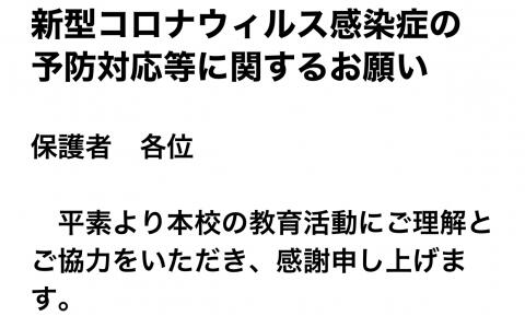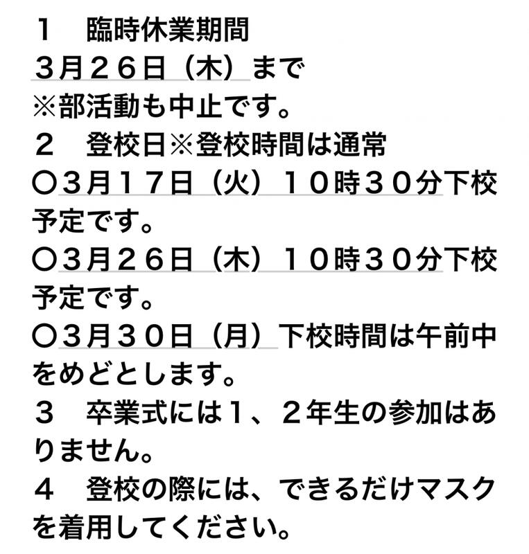 標記の件について、以下のとおりとなります。よろしくお願いいたします。なお、臨時休業及び春季休業の過ごし方のつきまして、再度、ご確認をお願いいたします。連日、地域の方々から連絡が入ります。重ねてお願い申し上げます。