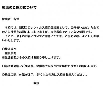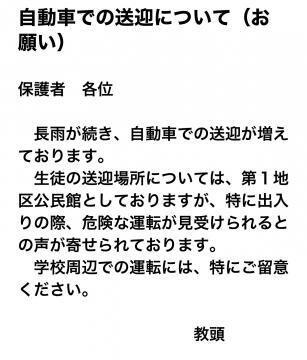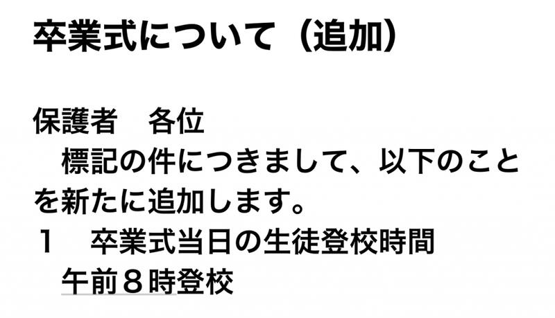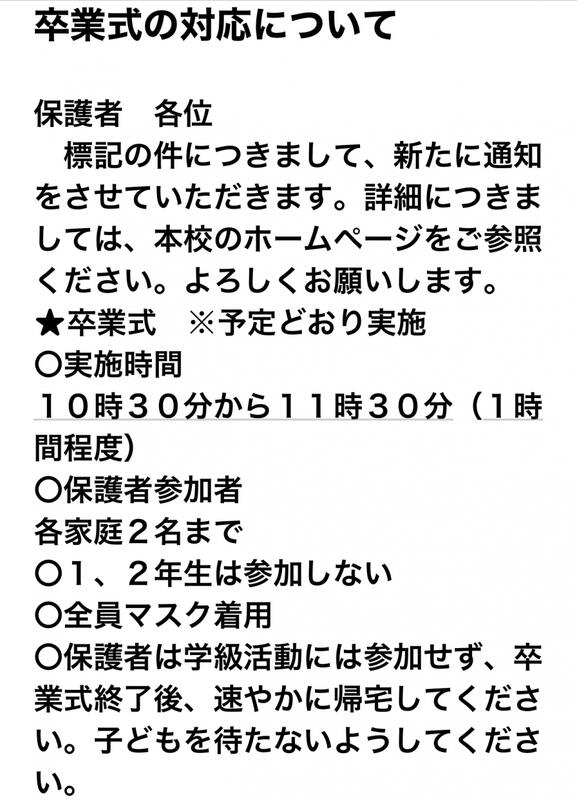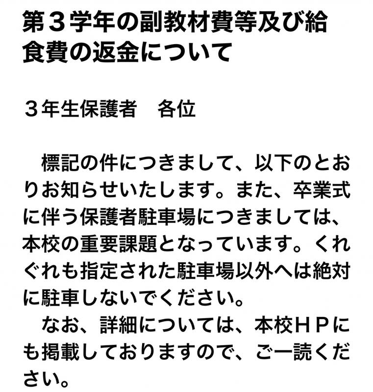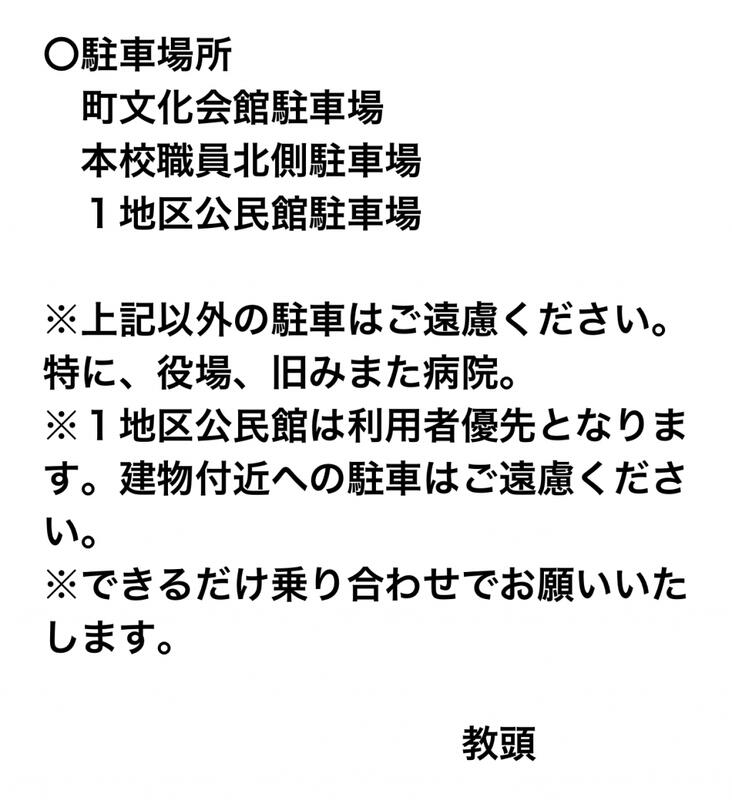 標記の件につきましてお知らせいたします。何卒、ご理解とご協力をお願いします。特に卒業式に伴う保護者駐車場については、本校の重要な課題となっておりますので、重ねてお願い申し上げます。