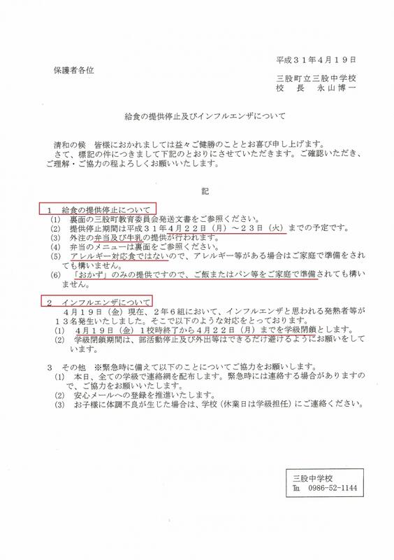 三股中学校の全校生徒とも教職員の指導の下、自主的に机等の下に避難し、被害はありません。ご安心ください。