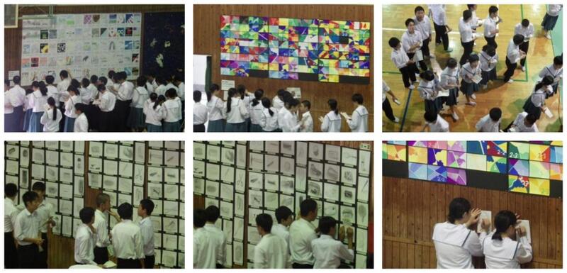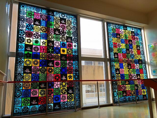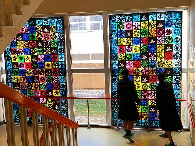 2年生が、文化祭で制作したステンドグラスが、中央階段に飾られました。