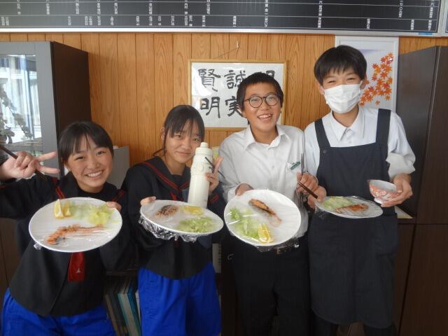 5時間目には、1年2組の椎原さん、久保田さん、樋口さん、猪之俣さんが鮭のムニエルを届けてくださいました。『レモンをきれいに切ったり、焦げすぎないようにバターでからめるのが難しかった。』と、にっこり笑顔で教えてくださいました。バターの風味のよい優しい味でした、ごちそうさまでした。