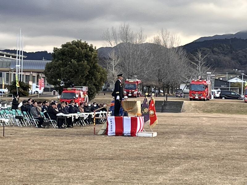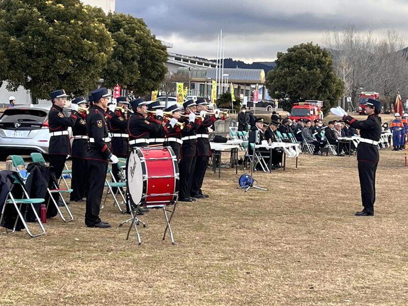 早朝より「三股町消防出初式」が行われました。機動本部、第1部~第7部、ラッパ隊の方々を中心に実施され、一糸乱れぬ隊列づくり、人員点呼、整備装着の勇姿が披露され、木佐貫町長、里岡消防団長等による行動確認がなされました。幼年消防クラブ発水や消防団一斉発水の後、表彰、祝辞と続き、最後に里岡団長の謝辞で締めくくられました。