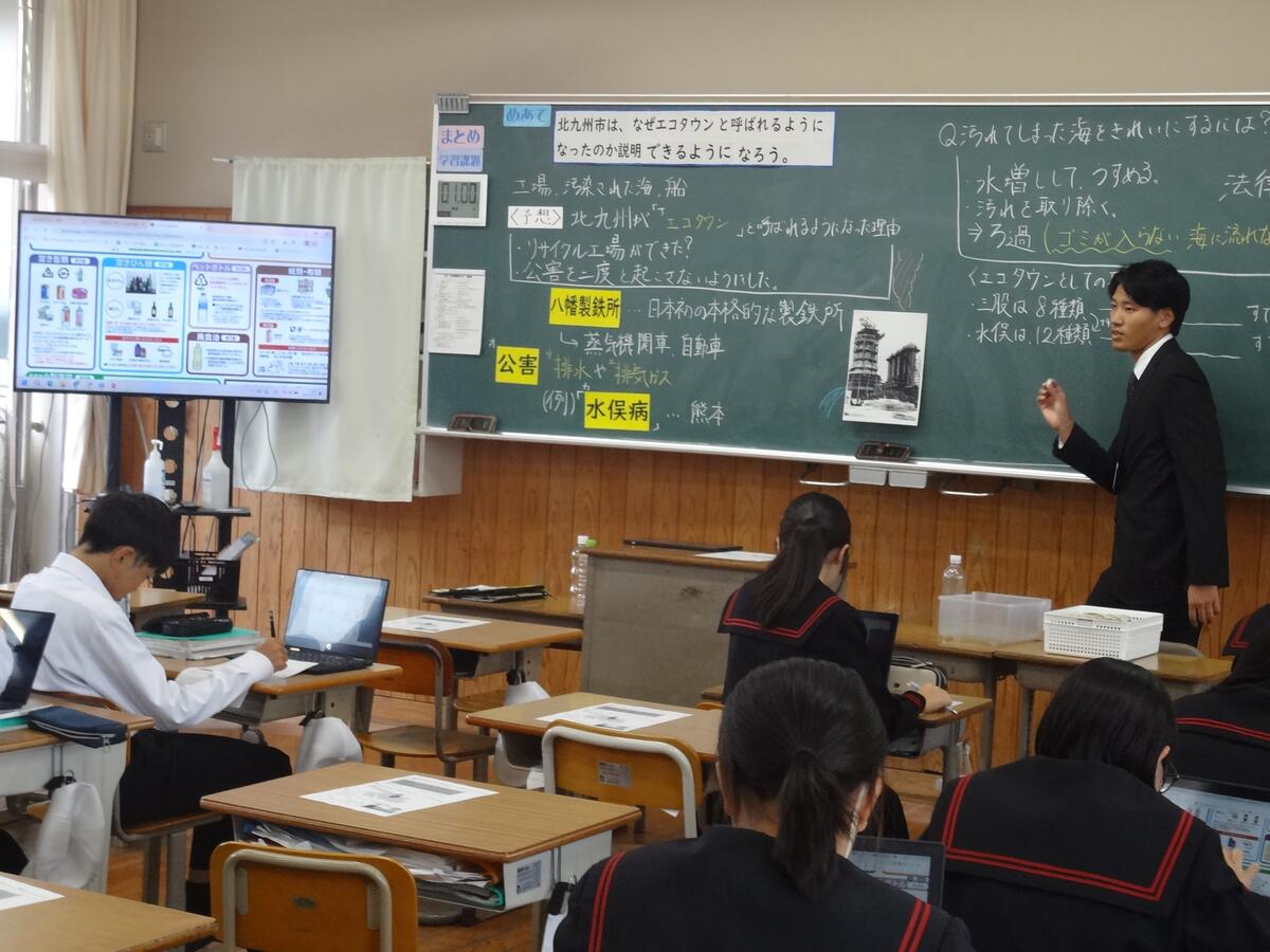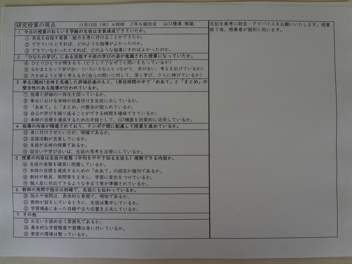 本日は、山口先生の研究授業が実施されました。2年6組の社会科の授業を沢山の先生方で参観し、私たち教員の授業力向上に役立てていきます。2年6組の皆さん、山口先生ありがとうございました。