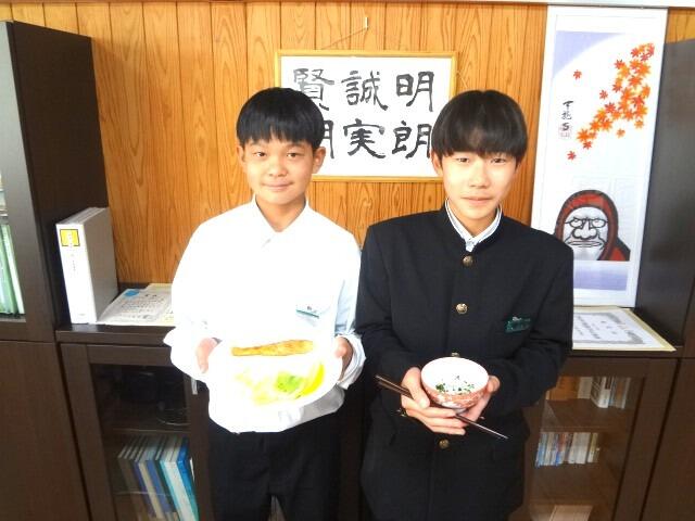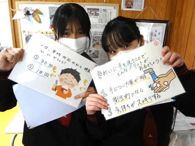 給食委員会の取組を見てください。2年生の早瀬さんと宮田さんが手にするボードはインフルエンザの予防にもなります!