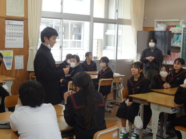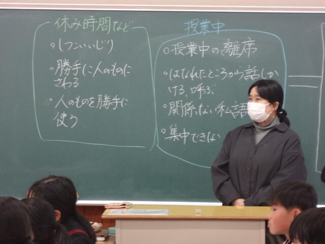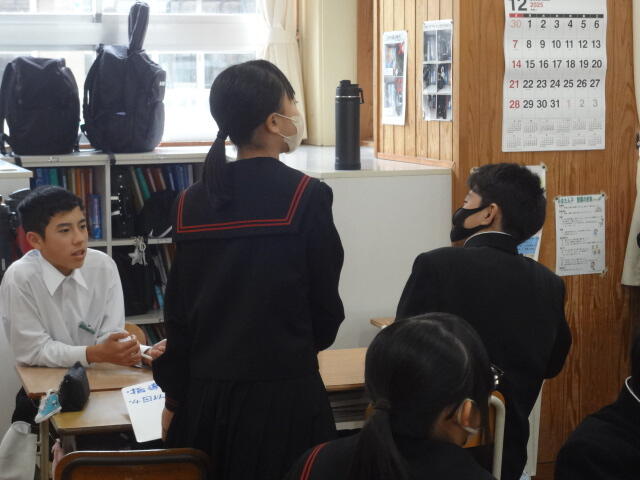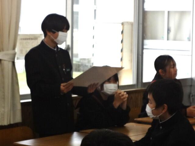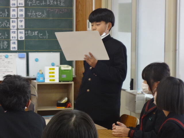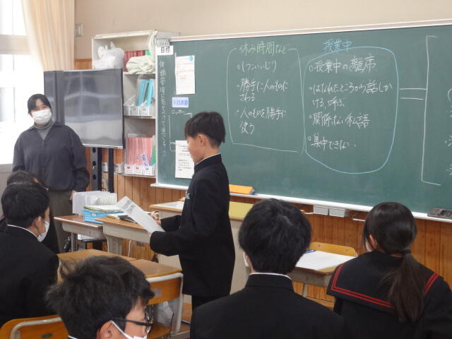 1年生は学級活動で、学期反省と課題改善の対策を決めていました。三股中学校は以前、スクールワイドPBSに取り組んでいました。罰を与えて改善するのではなく、正しい判断や行動に進んでいくように具体的に活動目標を設定したり、良い行動を賞賛したりする取り組みです。その結果が生徒会活動の「サツキ言葉」につながっており、引き継がれています。